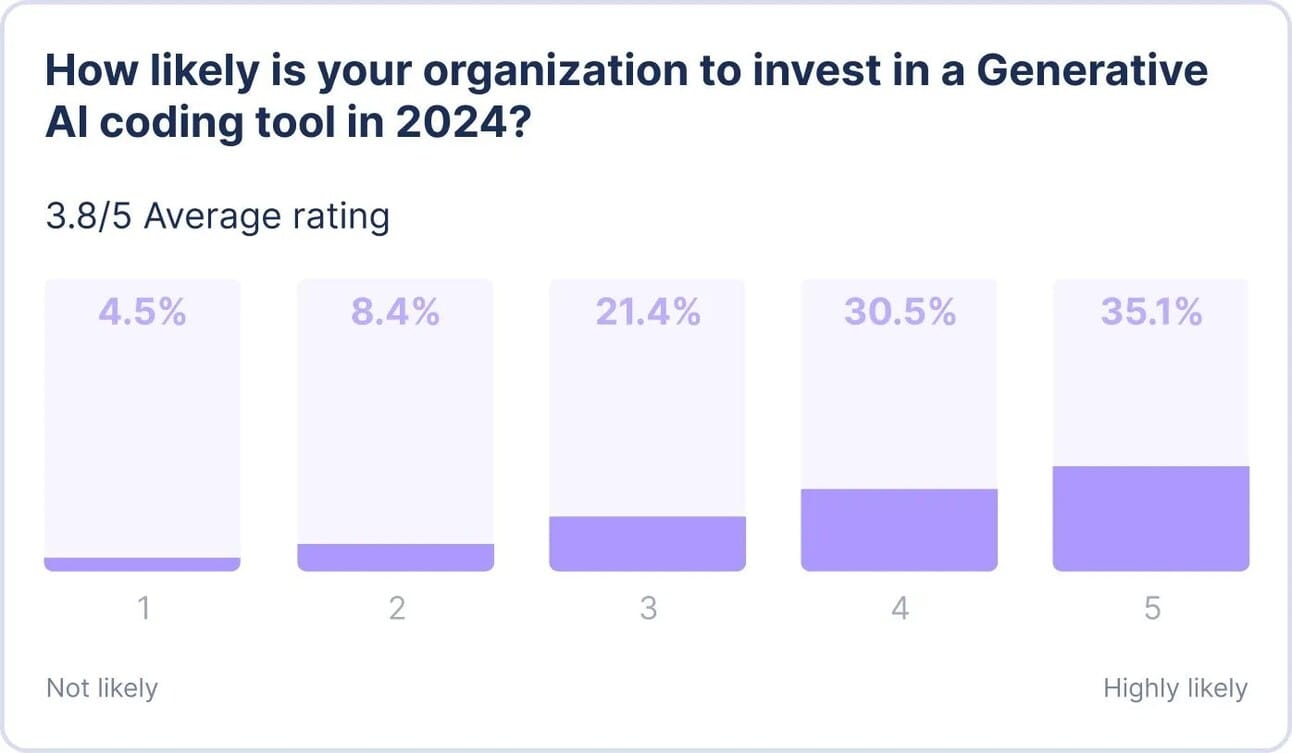 In 2024, GenAI is projected to be responsible for generating 20% of all code – or 1 in every 5 code lines. 87% of software engineering leaders surveyed are likely to or already investing in GenAI coding tools for 2024. Code review is becoming a frontline skill for the next generation of developers.