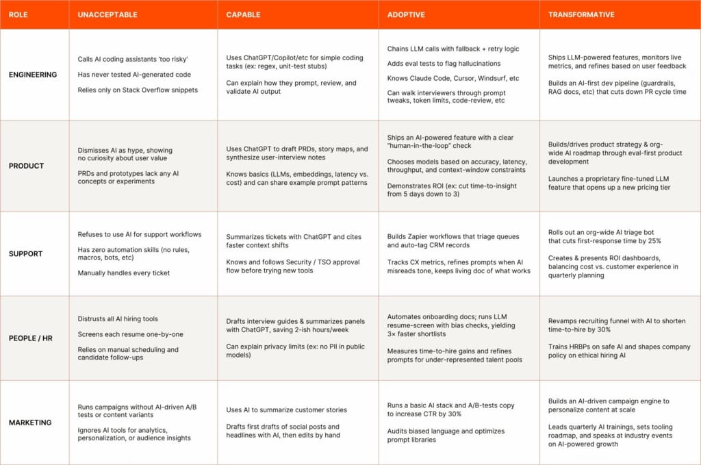 Struggling with defining your team’s AI proficiency? Wade Foster, the CEO at Zapier, shared the company’s framework for measuring how well their employees in different roles and departments use AI. Maybe we could apply it too?